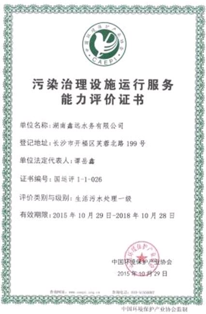 湖南乐天堂fun88集团水务有限公司喜获湖南省首家“污染治理设施运行服务能力一级”证书